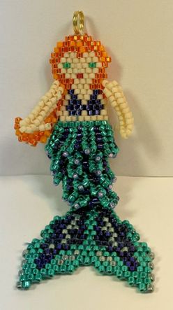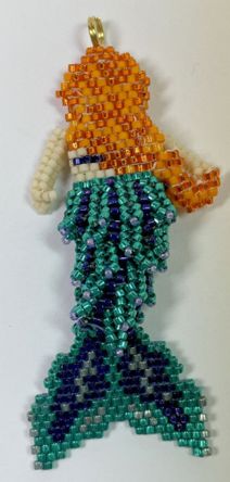 This precious little beaded mermaid is worked in brick stitch, herringbone stitch, and ladder stitch. She is made with size 11/0 cylinder beads, with size 15/0 seed bead accents. Her lower body is articulated. She is 3” long.